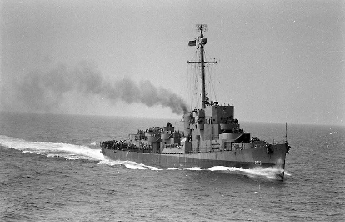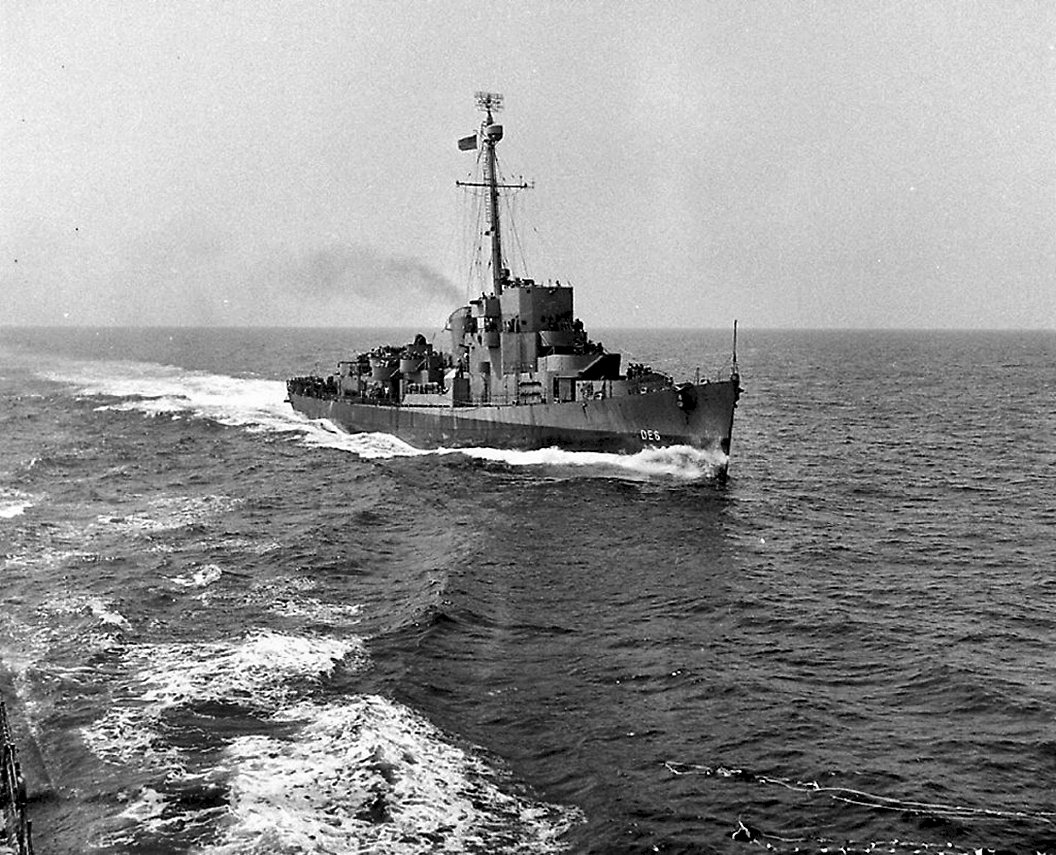 Edsall (DE 129) show Steele at 07:15 departing anchorage C-3, Naval Operating Base at Bermuda for a day of drills, exercises, and battle problems. (Photos by Dmitri Kessel for Life Magazine) |