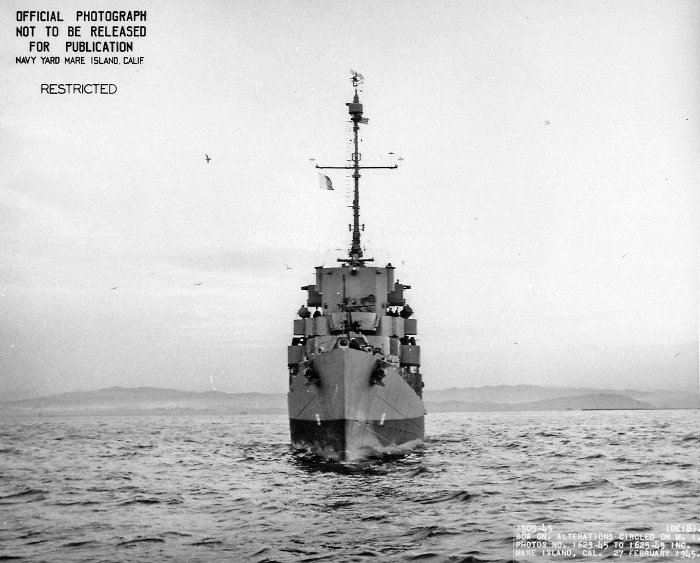 74k | 27 February 1945: Bow on view of Gilmore off Mare Island. (U.S. Navy Photo #DE-18-1505-45) |