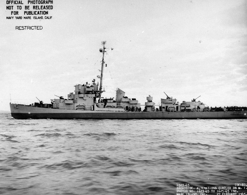 98k | 27 February 1945: Broadside view, she was in overhaul at the yard from 19 January until 3 March 1945. (U.S. Navy Photo #DE-18-1505-45) | ||