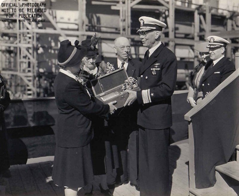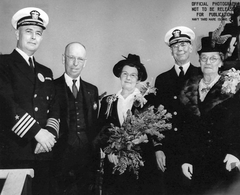Radm. W. L. Friedell Commandant of Mare Island Navy Yard prior to her launching. Left to right: Mrs. Bert A. Barr (Sponsor), Mrs. A. Barr (Matron of Honor), Mr. Bert A. Barr, Radm Friedell