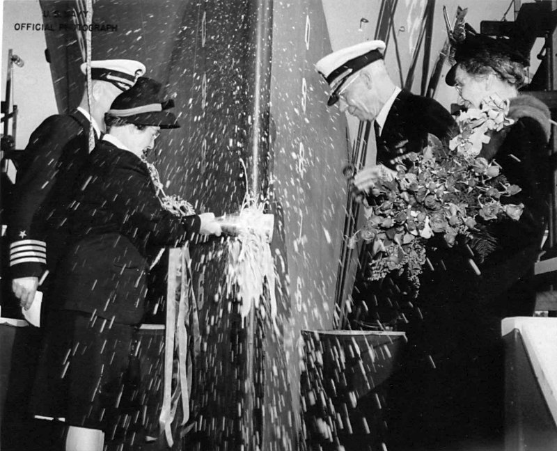 119k | 21 November 1942: Mrs. Bert A. Barr, Sponsor is seen christening the future HMS Duff (BDE 20). Others pictured are from left to right: Capt. F. G. Crisp, Mrs.