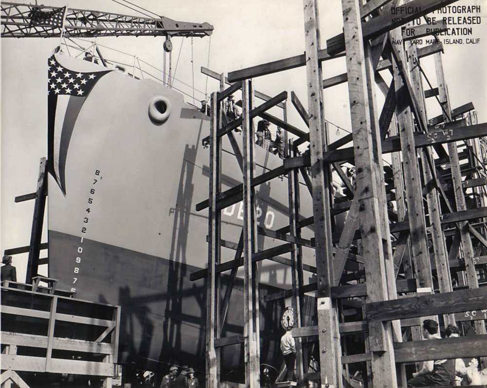 189k | 21 November 1942: Mare Island Navy Yard - Bow of the future HMS Duff (BDE 20) just prior to her launching. (U.S. Navy photo #DE-20-7155-42) |