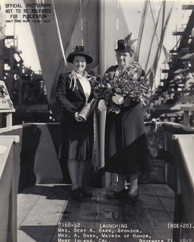 95k | 21 November 1942: Mare Island NSY - Mrs. Bert A. Barr (Sponsor) and Mrs. A. Barr (Matron of Honor) are pictured at the bow of the future HMS Duff (BDE 20)