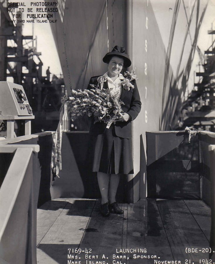 114k | 21 November 1942: Mare Island NSY - Mrs. Bert A. Barr (Sponsor) is pictured at the bow of the future HMS Duff (BDE 20) prior to the launching of ship. (U.S. Navy photo #DE-20-7169-42) | ||