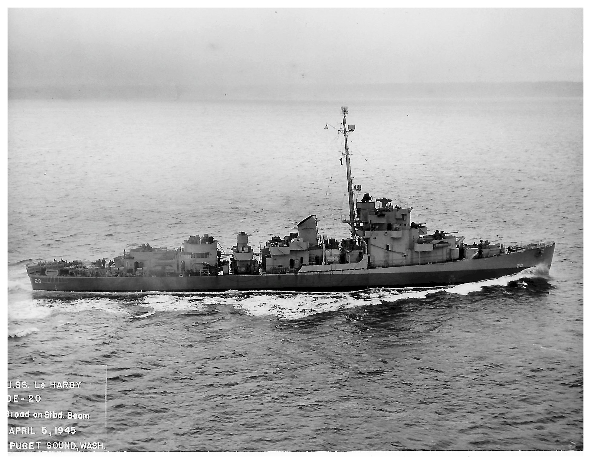 513k | 05 April 1945: Bremerton, Wash. - USS LeHardy (DE 20) underway in Puget Sound. (U.S. Navy Photograph #NH 81340, courtesy of Donald M. McPherson, 1974, from the collections of the U.S. Naval History and Heritage Command) |