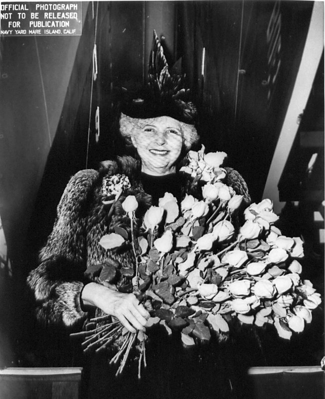 112k | 18 December 1942: Mrs. Nelson H. Goss, Sponsor is pictured in front of the bow of the HMS Essington (BDE-21) at Mare Island. (U.S. Navy photo #DE-21-7939-42) | ||