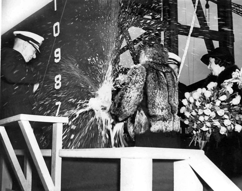 1188k | 18 December 1942: Mrs. Nelson H. Goss the Ship's Sponsor is pictured christening the HMS Essington (BDE-21) at Mare Island. From left to right: