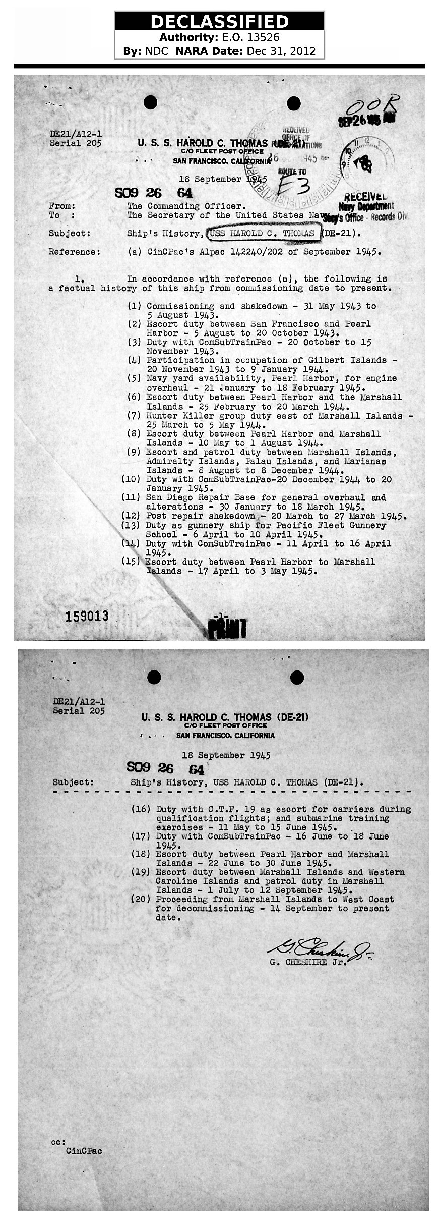 | View the USS Harold C. Thomas (DE 21) DANFS history entry located on the Naval History and Heritage Command web site. |