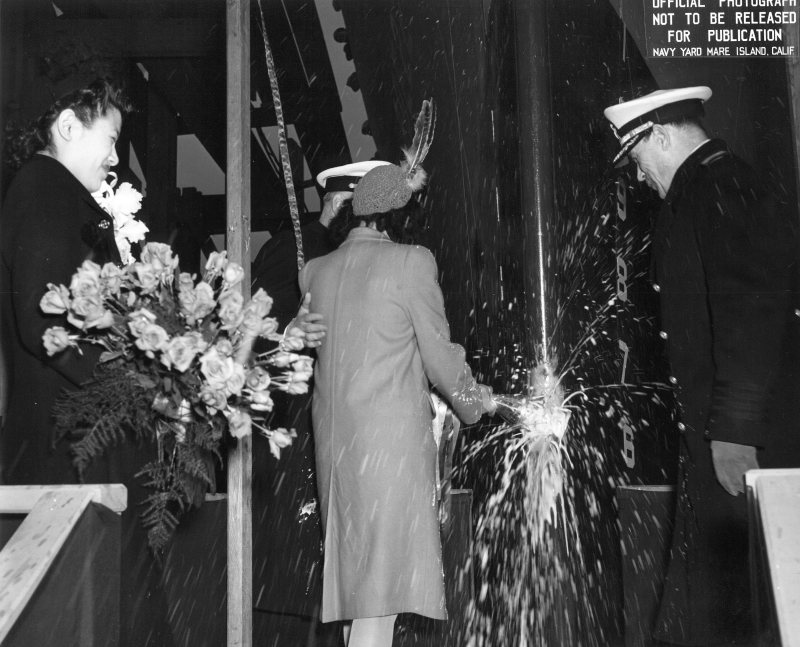 97k | 19 December 1942: Vallejo, Cal. - Christening of Wileman (DE 22 / BDE 22) at Mare Island Navy Yard. Mrs. Lilly Ching, Matron of Honor, left, Captain Frederick Crisp,