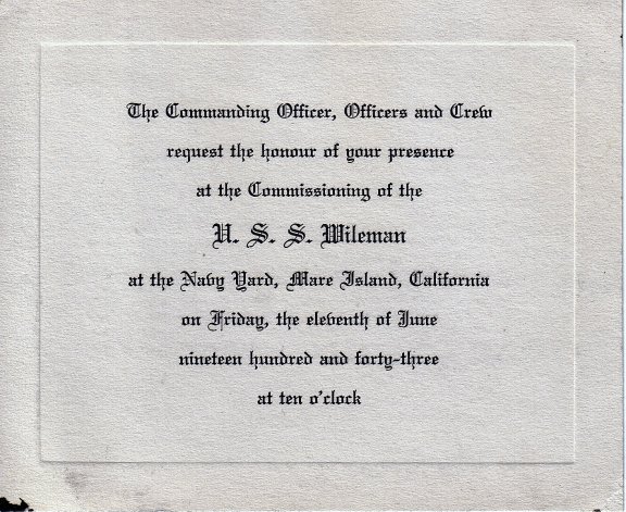 82k | Invitation to Wileman's Commissioning. (from the Memorabilia of Lt. George Robertson) | Ed Williams grandson of Lt. George Robertson Photos taken by Lt. Robinson | |