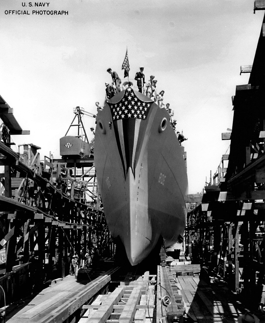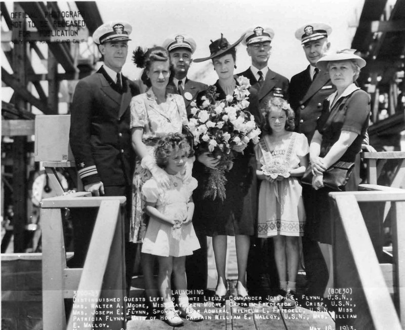 Mrs. Walter A. Moore, Miss Kathleen Moore, Capt F. G. Crisp, Mrs. Joseph E. Flynn (Sponsor), Radm. Wilhelm L. Friedell (Shipyard Commandant), Miss Patricia Flynn (Maid of Honor),