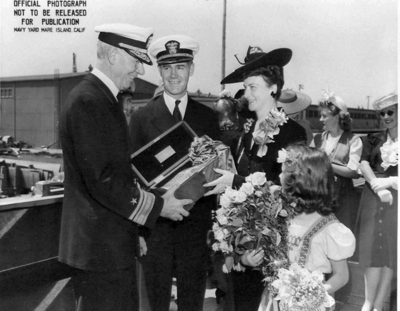 106k | 18 May 1943: Radm. Wilhelm L. Friedell (Shipyard Commandant) presents the bottle of champaign sponsor of USS Martin (DE 30) at Mare Island. Left to right: Radm W. L.