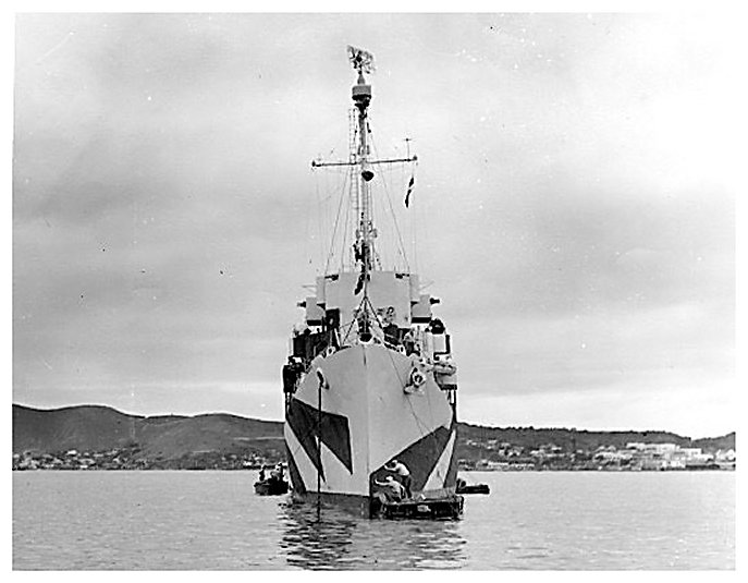 57k | March / April 1944: Bow on view of USS Martin (DE 30) at an unidentified location, probably Noumea. The ship is painted in camouflage scheme MS31/1D. (U.S. Navy Bureau of Shipping Photo #BS 131011 from the United States National Archives) |