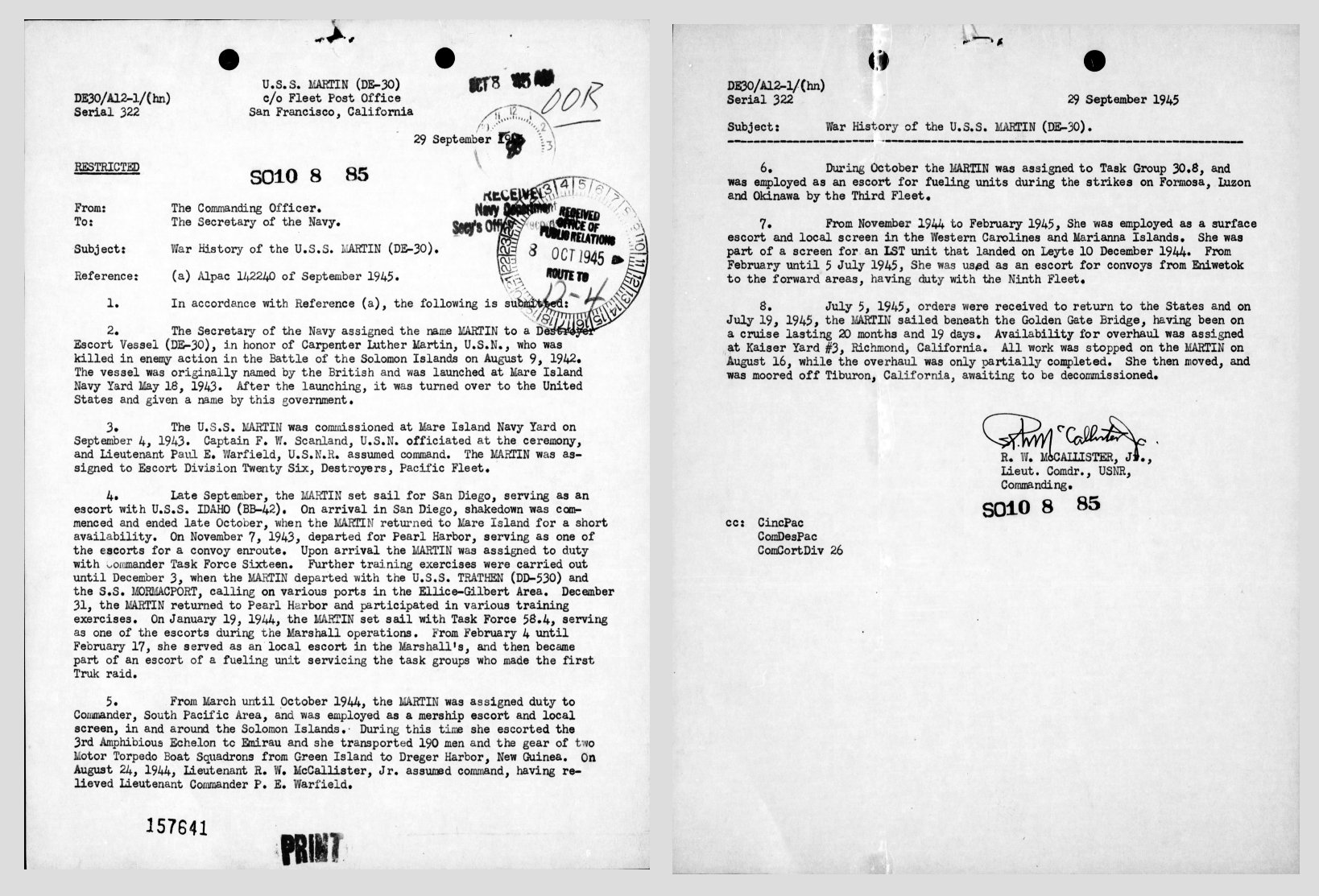 | View the official War History of USS Martin as submitted by the ship at war's end. |