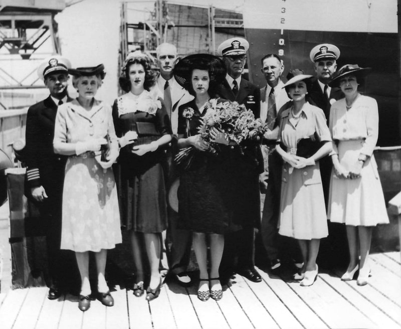 (Maid of Honor), Mr. Victor N. Fair, Sr., Mrs. Victor N. Fair, Jr., (Sponsor), Radm W. L. Friedell (Shipyard Commandant), Mr. & Ms. B. J. Ramsaur (Parents of the Sponsor), Capt. F. G. Crisp,