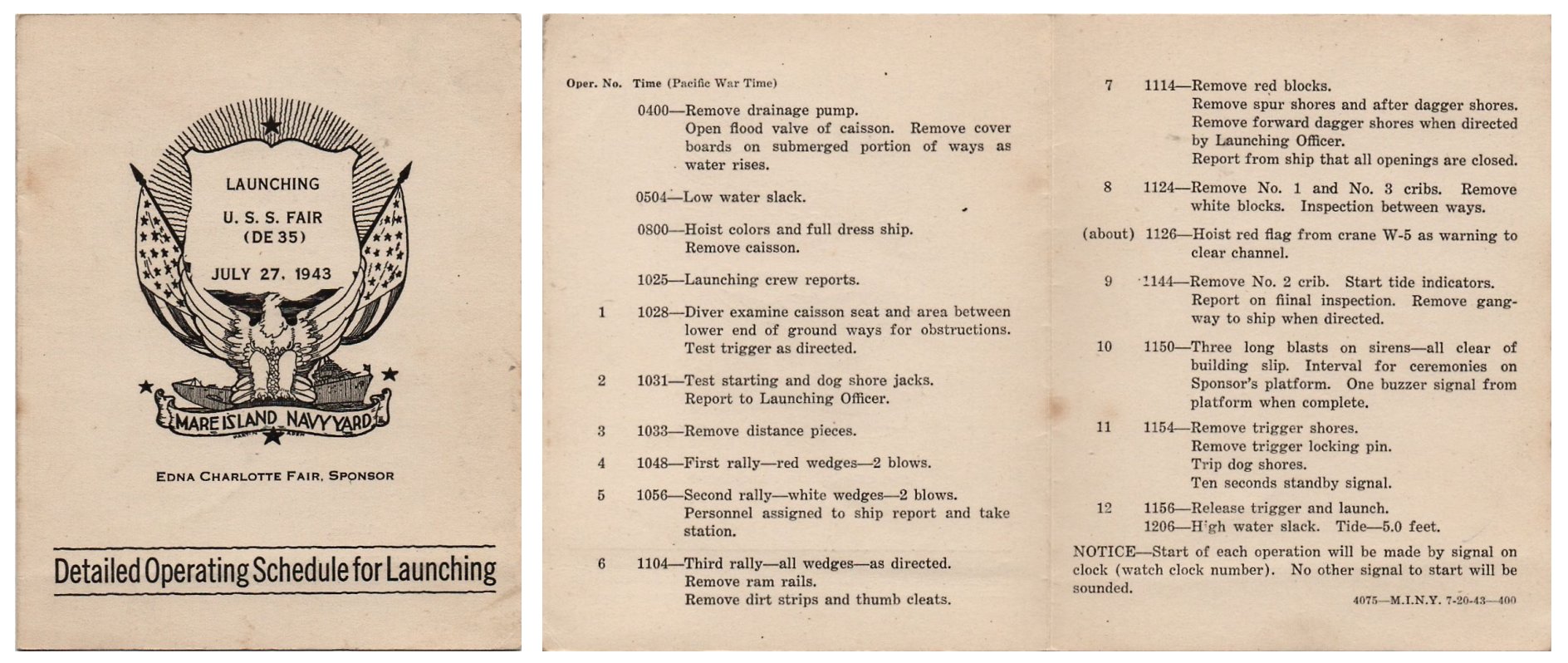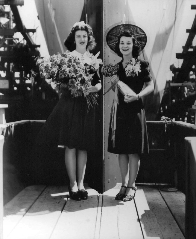 81k | 27 July 1943: Miss Jeanette Fair (Maid of Honor), left, and Mrs. Victor N. Fair, Jr. (Sponsor) are seen at the bow of the soon to be launched Fair at Mare Island. (U.S. Navy Photo #DE-35-5384-43) | ||