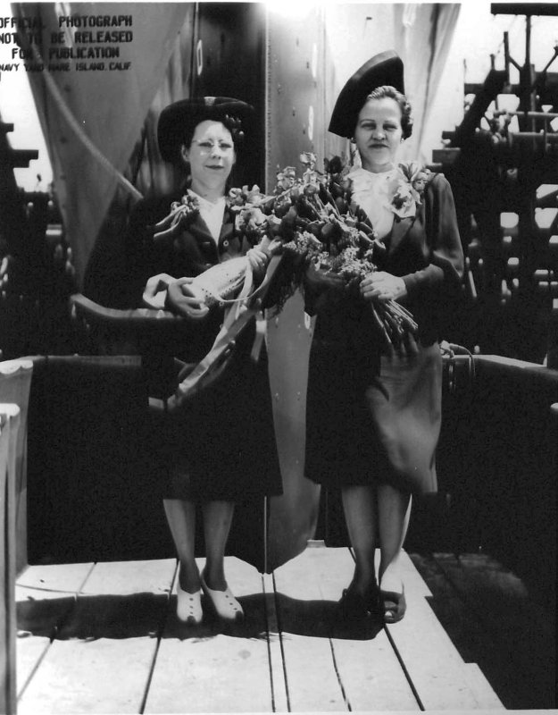 84k | 28 July 1943: Mrs. Authur C. Manlove (Sponsor), left, and Mrs. Dorothy Mayfield (Matron of Honor) are shown in front of the bow of USS Manlove