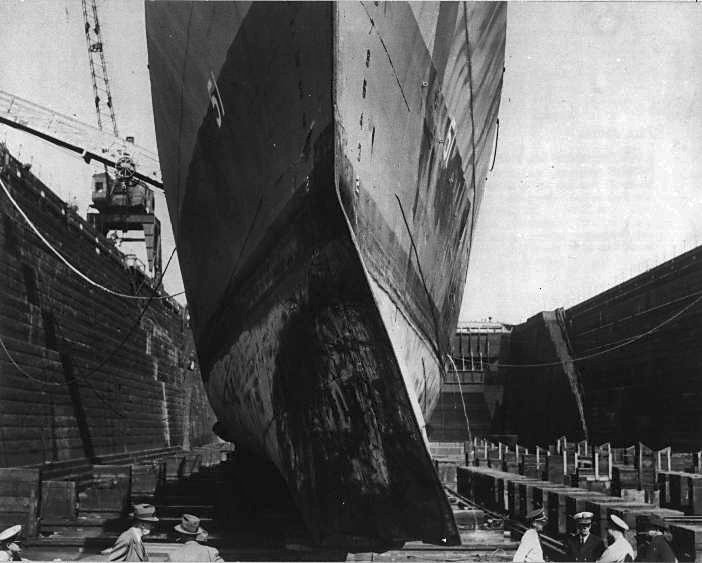 63k | May-June 1944: Boston, Mass. - USS Buckley in drydock at the Boston Navy Yard, her bow bent from ramming U-66. (Photo from Captain Jerry Mason, USN ret.) |
