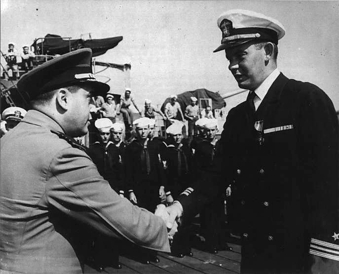58k | May-June 1944: Boston, Mass. - Lcdr. Brent Abel, USNR, receives the Navy Cross for action as Commanding Officer of USS Buckley from Captain