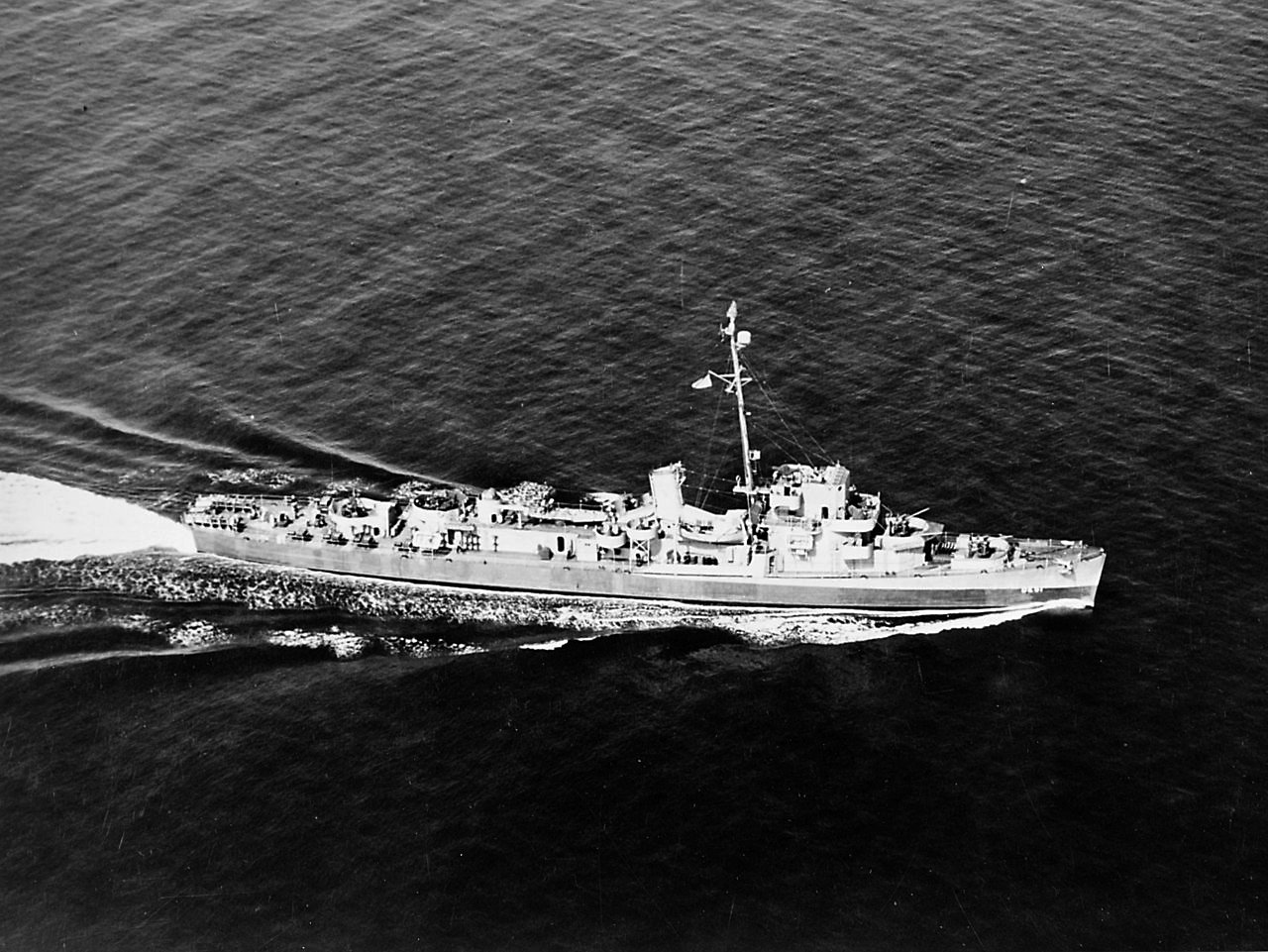 309k | 10 June 1944: The destroyer escort USS Buckley (DE 51) underway in the Atlantic Ocean off Boston, Massachusetts 1944. Photographed from a blimp of squadron ZP-11. (U.S. Navy photo #80-G-236610 from the Naval History and Heritage Command) |