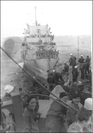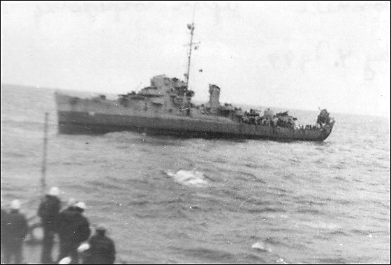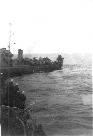 38k | 04 May 1944: USS Donnell being taken in tow after a U-boat attack. (contributed by shipmates of the USS Reeves (DE 156 / APD 52) |