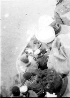 Enterprise (CV 6) at Pearl Harbor, H.I. On arrival, he was assigned as Scouting Six's assistant engineering officer. From the book Never Call Me a Hero: Dusty Kleiss and the Battle of Midway: Donnell was shot down during his first battle, the raid against the Marshall Islands, 01 February 1942. At 7 AM, Scouting Six attacked the Japanese base on Roi Island. Just after Donnell pulled up from his dive, a Japanese fighter plane--an A5M "Claude"--caught sight of Donnell's aircraft--6-S-18-- and opened fire on it. A Scouting Six gunner, RM 3/c Jack Leaming, saw what happened. He remembered: "I turned, looked over my starboard shoulder, and saw an SBD opposite us receive a direct hit. The starboard wing was blown off. The wing spiraled upward through the air as the rest of the plane dropped straight down. This happened very quickly and was directly in front of us but too far away for me to identify." Leaming saw the final moments of Donnell and his gunner, AMM 2/c Alton J. Travis. Their damaged SBD caught fire and plummeted into the water northeast of Roi. Both men were killed. For his courage in pressing home his attack in the face of enemy fighter opposition and heavy antiaircraft fire, Ensign Donnell was posthumously awarded the Air Medal. USS Donnell (DE 56) (1943-1945) was the first ship to be named in his honor. (Photo courtesy of Chris McDougal from the National Museum of the Pacific War at Fredericksburg, Texas) |