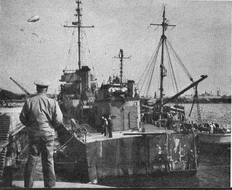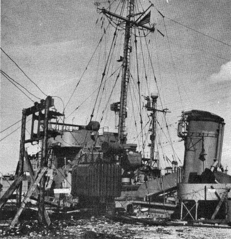 295k | From the September 1945 "All Hands" magazine, the photo shows Donnell at Cherbourg being used as a power plant after her fantail was blown off by a German torpedo. The transformer on deck was captured from the Germans. | Darryl Baker PNCM, USNR (ret.) Vallejo Naval & Historical Museum | |
