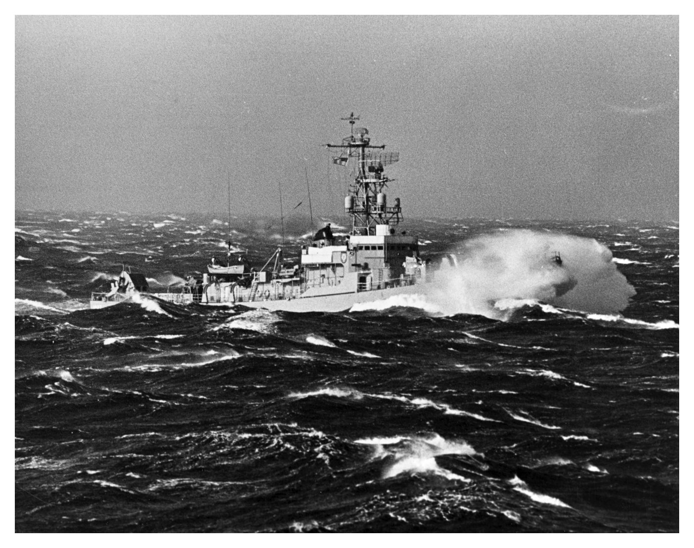 313k | 19 October 1965: the far South Atlantic - Two views John Willis (DE 1027) maneuvering into heavy seas while operating with the Unitas VI task force off the Argentine coast. (U.S. Naval Historical Center photo #USN 1114319-C and #USN 1114319-B from the Naval History and Heritage Command) |