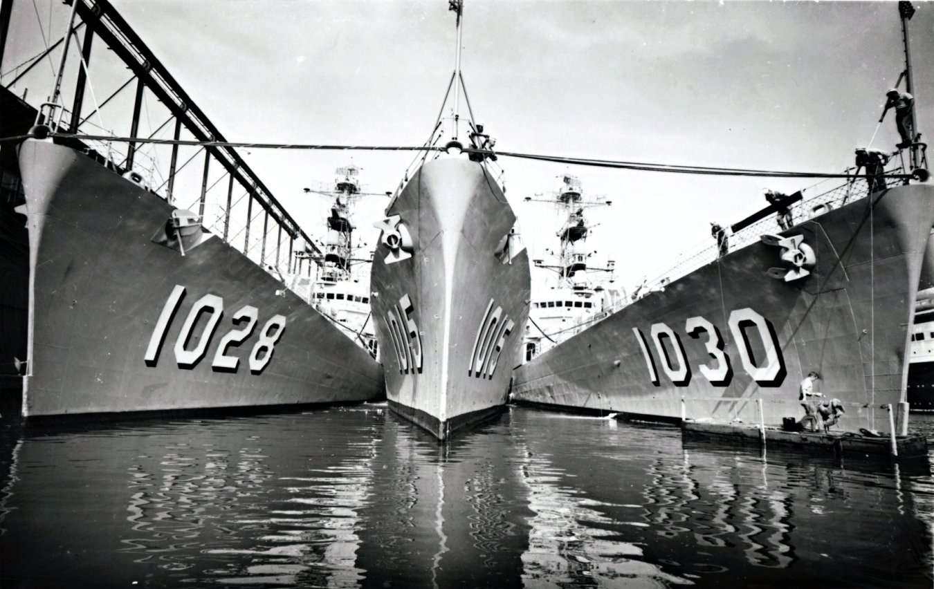 214k | 20 September 1962: New York, N.Y. - The trim lines of three destroyer escorts form a striking image along Pier 84. These ships (left to right) USS Van Voorhis (DE 1028), USS Hammerberg (DE 1015) and USS Joseph K. Taussig (DE 1030), are part of a six-ship group visiting the city before going back to sea. | Robert M. Cieri | |