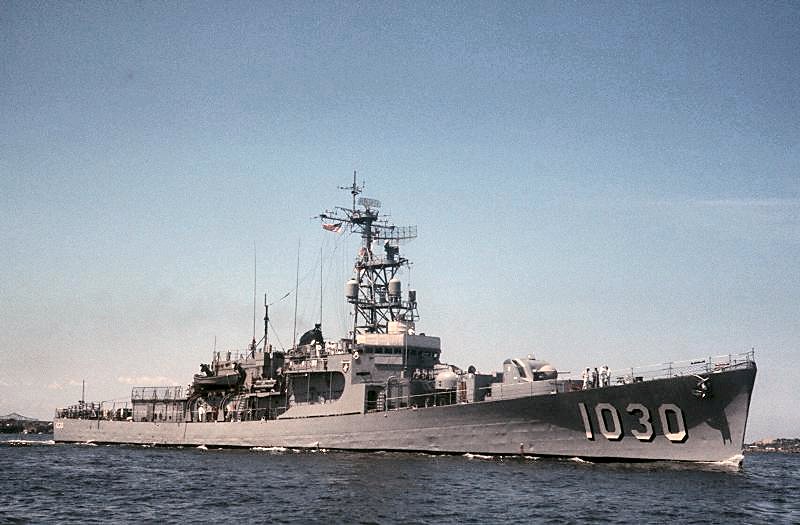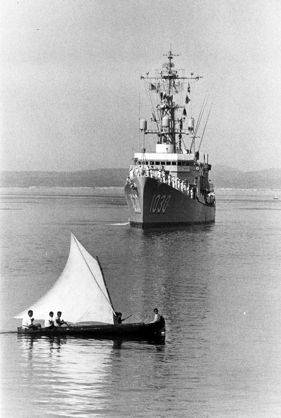 Joseph K. Taussig (DE 1030) as she enters the port. (U.S. Naval Historical Center photo, Catalog #L53-41.08.08 from the Naval History and Heritage Command) |