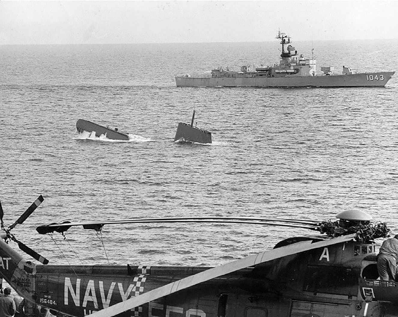 674k | 04 July 1970: the Atlantic Ocean - Odax (SS 484) surfacing in front of McDonnell (DE 1043). Photo taken from the flight deck of Wasp (CVA 18). | Courtesy of imt.net | |