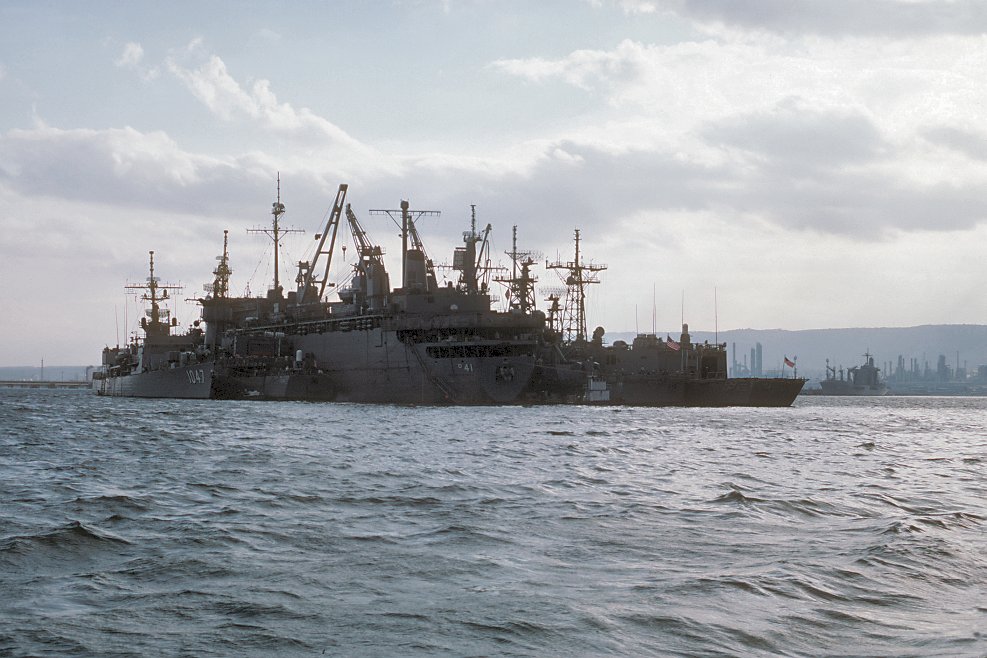 129k | 08 November 1988: Augusta Bay, Sicily, Italy - A view of ship's composing the aircraft carrier USS John F. Kennedy (CV 67) battle group tied up alongside each