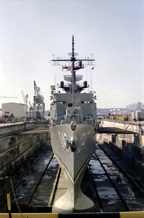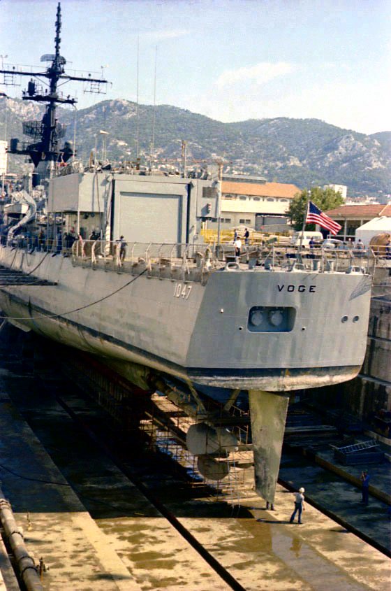 81k | early September 1976: Toulon, France - Voge in drydock at Toulon after the collision with a Soviet Echo II submarine in late August 1976. | John Locke Austin, Tex. Jan. '75 - Sep. '76 | |