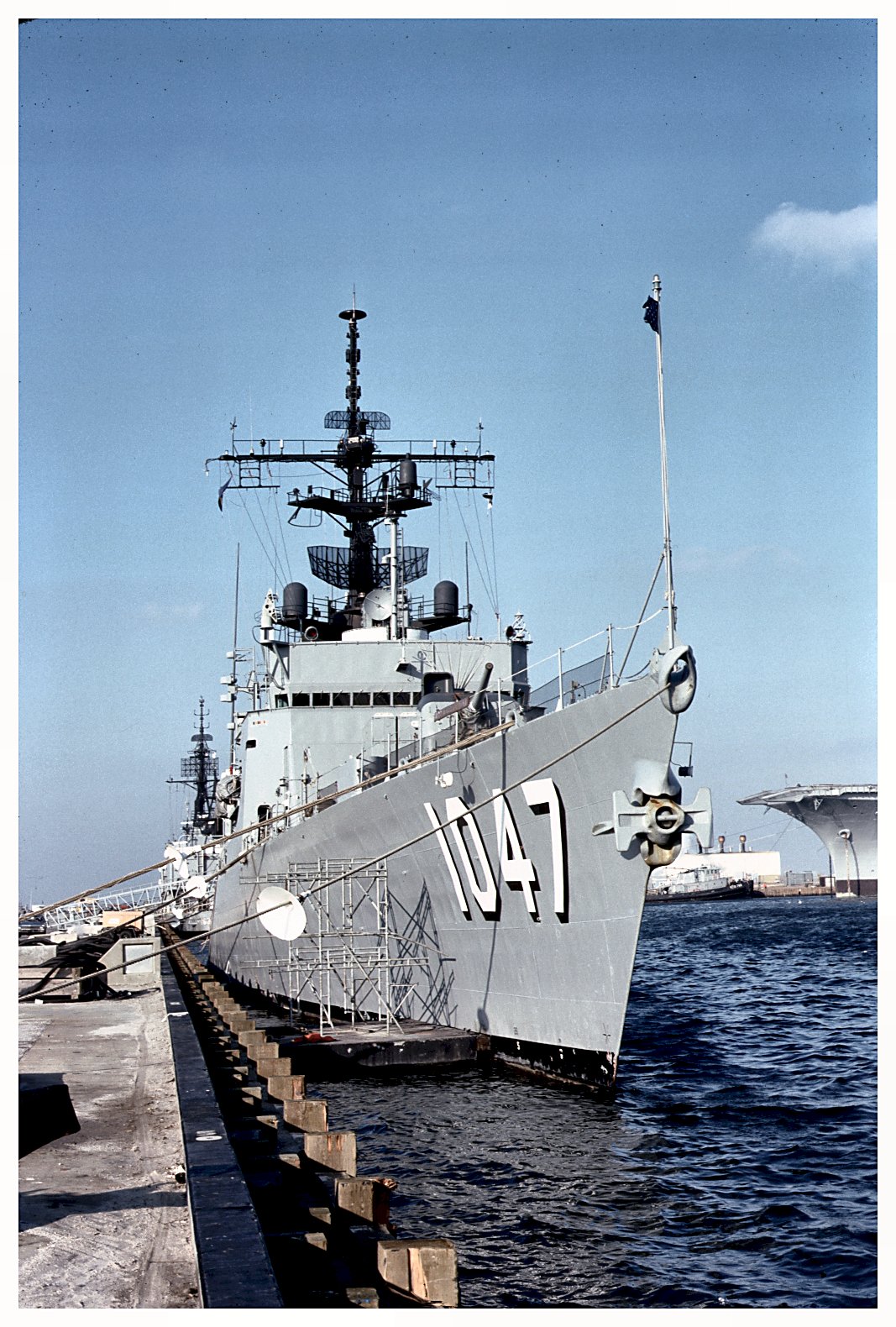 371k | February 1978: Mayport, Fla. - USS Voge (FF 1047) moored at Naval Station Mayport. Note, scaffolding set up for sidecleaners. (Heilenday photo #II 0434A from the Heilenday Collection) |
