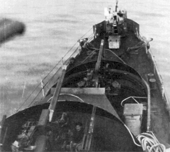 The forecastle of Ekins, looking down from the bridge. The bowchaser detail is plain, and the Coastal Forces type rocket flare projectors can be seen on "B" gun.