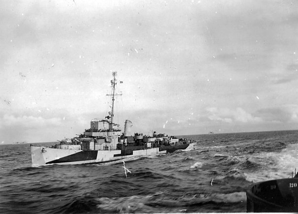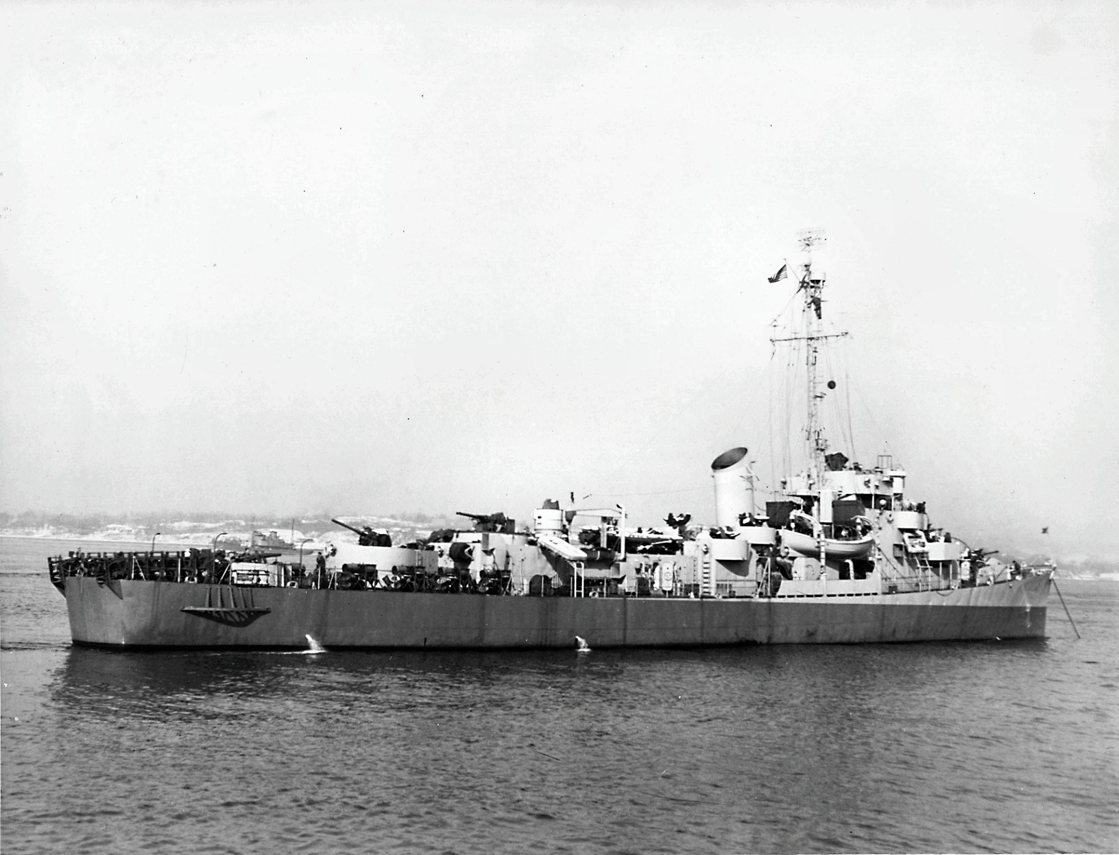 46k | August 1945: View of Hammann from USS Brough (DE 148) near Hawaii. Hammann is painted in camouflage measure 32, and on