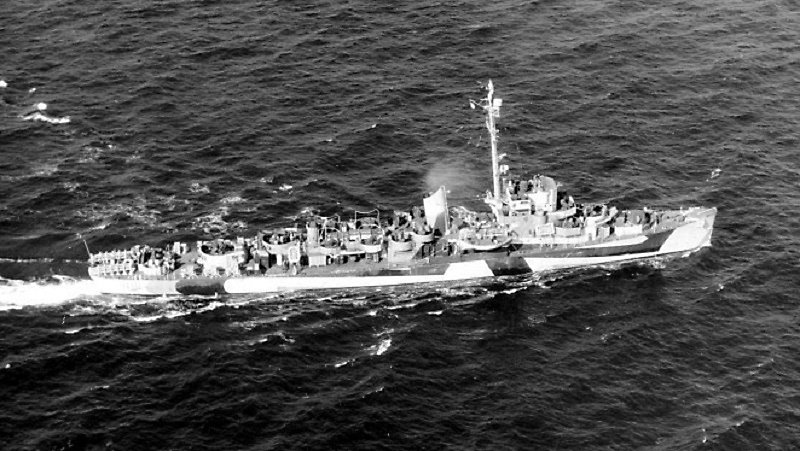 101k | 30 October 1944: the Atlantic Ocean - USS Hammann (DE 131) is shown in an aerial photo from the starboard side wearing camouflage 32/3D modified. This