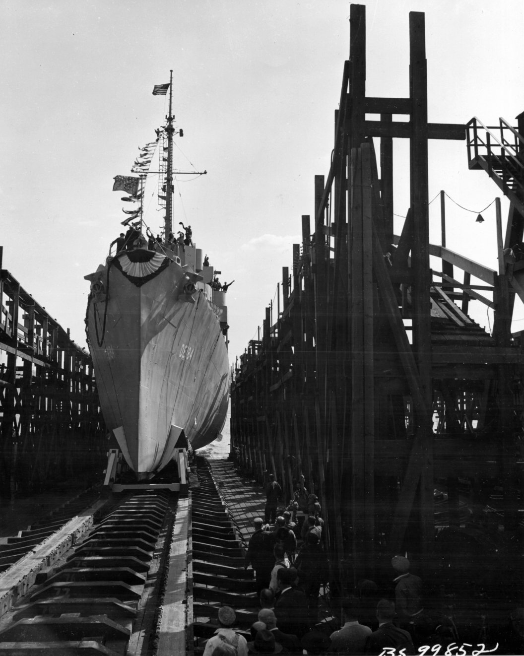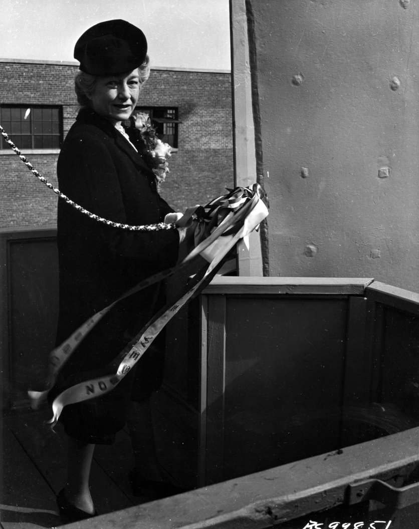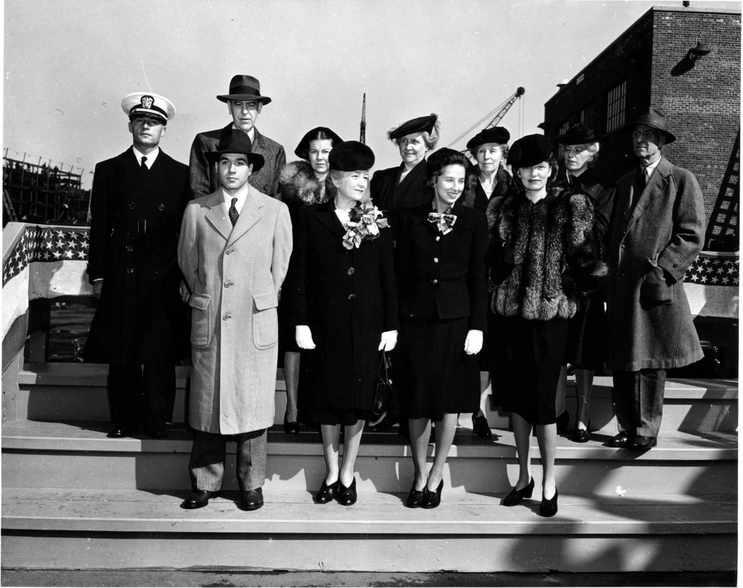 191k17 October 1943: Port Newark, N.J. - Three views of Wesson's launch and christening. The left photo shows the christening party posing for a pre-ceremony portrait. The center photo shows Mrs. Eleanor Wesson, mother of Lt.(jg) Morgan Wesson, preparing to break the traditional champagne bottle over the ship's bow, and the third photo shows the future Wesson sliding down the building way into the Upper Newark Bay. (U.S. Navy photos #'s 19-N-99849, 19-N-99851, and 19-N-99852 from the National Archives and Records Administration, College Park, Md.; courtesy of Chris Wright) 0618407 - 0618408 - 0618409 |