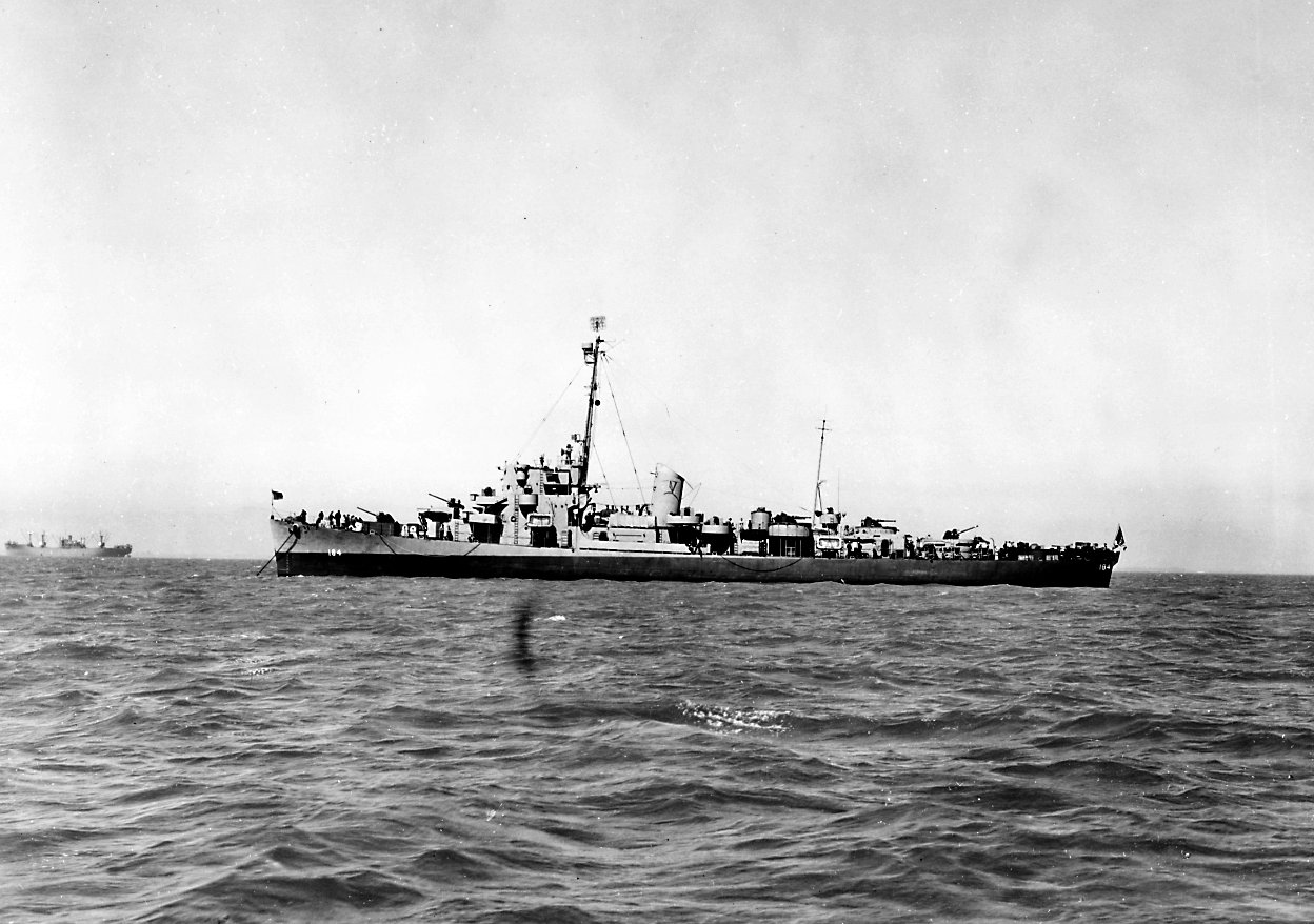 78k | 01 July 1945: Mare Island Navy Yard, Vallejo, Cal. - Bow on view of Wesson at Mare Island. (U.S. Navy photo #DE-184-4897-45) | ||