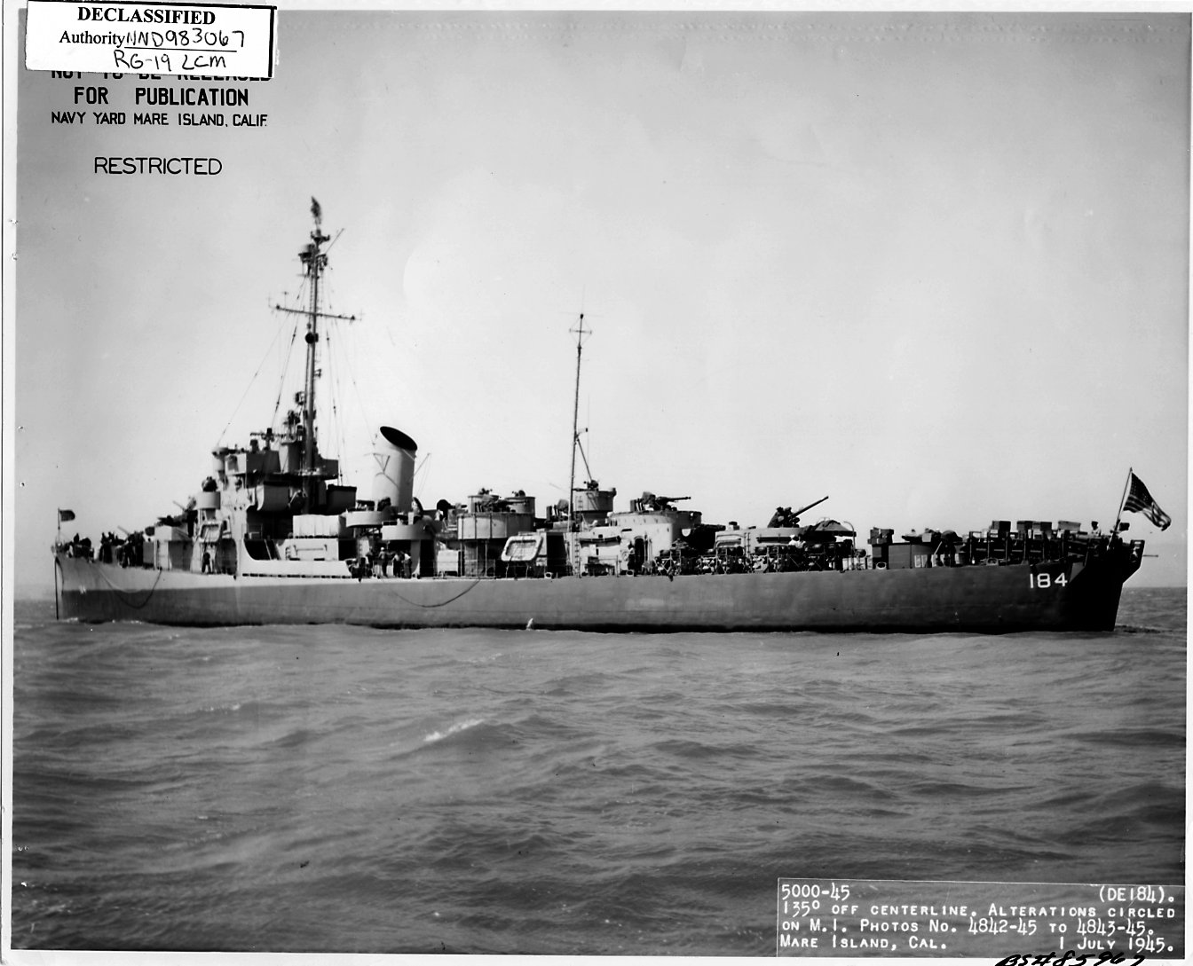 91k | 01 July 1945: Mare Island Navy Yard, Vallejo, Cal. - Stern view of Wesson at Mare Island. (U.S. Navy photo #DE-184-5001-45) | ||