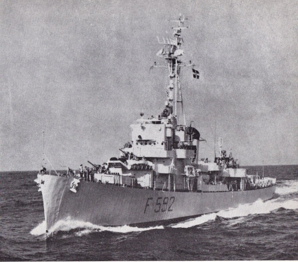 273k | The Italian Navy frigate Andromeda (F 592, Ex-USS Wesson) underway at speed during a NATO Mediterranean exercise in 1972. Note new pentad mast, with new and heavier