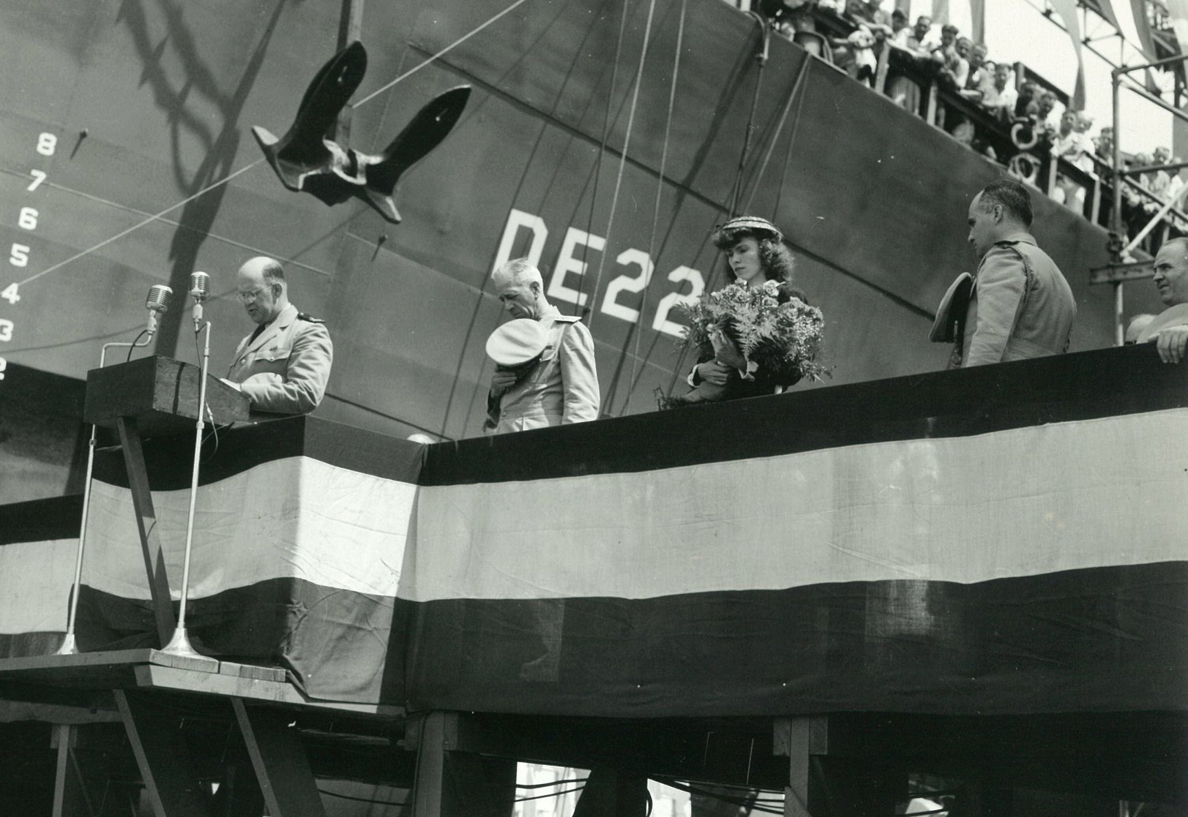 290k | 03 July 1943: Philadelphia, Pa. - A Navy chaplain gives the opening prayer at the christening and launching of the future USS Fowler (DE 222). Mrs. Patricia Fowler