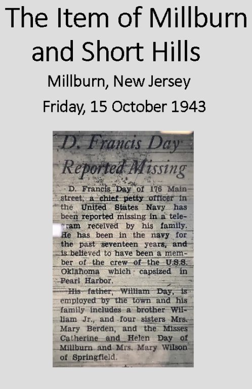 51k | Francis Daniel Day, the son of William Day, was born on 25 July 1904 in Millburn, N.J. Growing up with his brother and four sisters, he enlisted in the