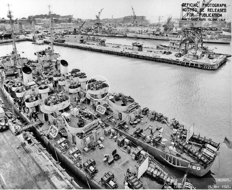 179k | 26 May 1945: Forward plan view. Areas modified are indicated by black circles. William C. Miller is inboard. (U.S. Navy Photo #DE-260-3814-45) | ||