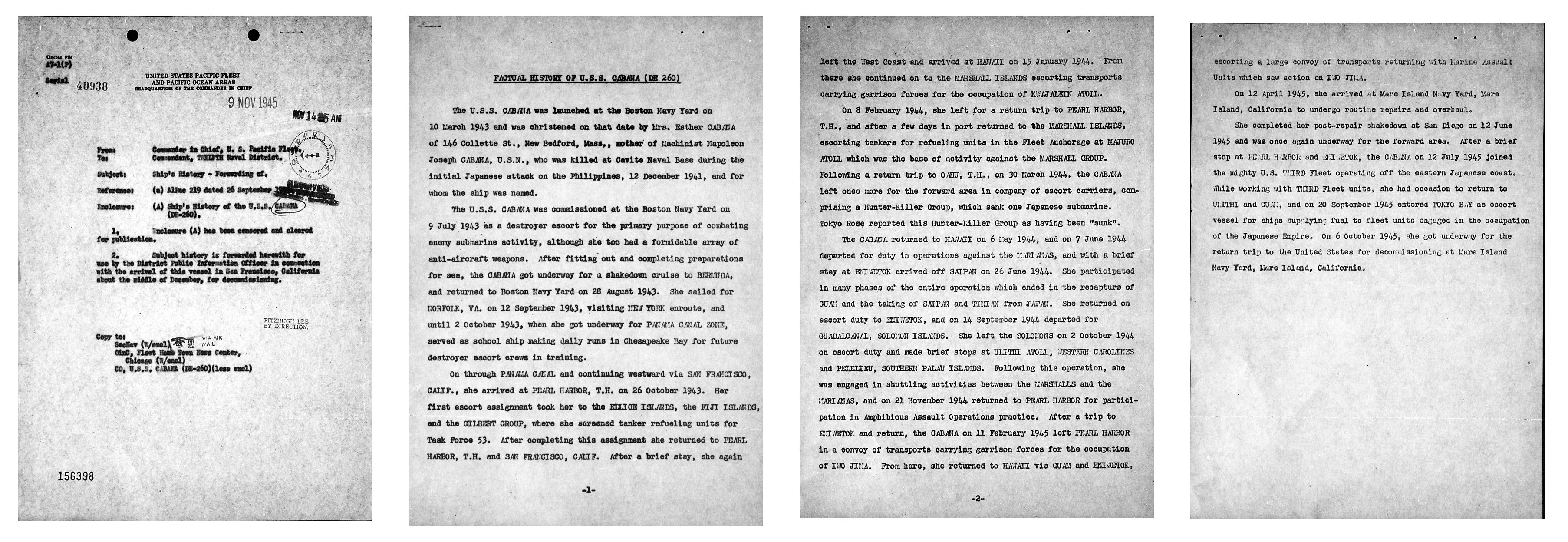 | View the official War History of USS Cabana as submitted by the ship at war's end. |