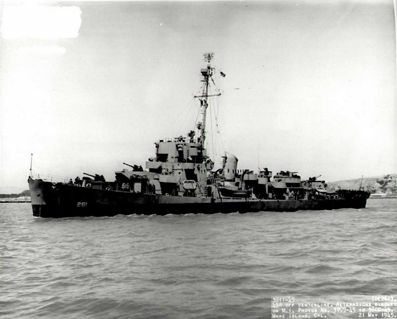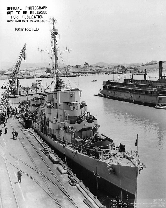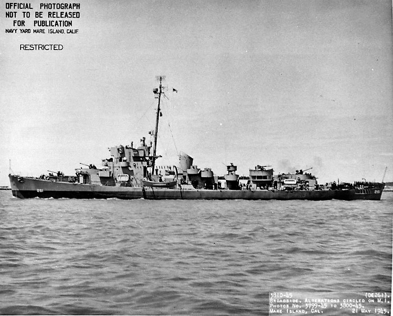 110k | 21 May 1945: Broadside view of Dionne. She was in overhaul at Mare Island from 16 April until 28 May 1945. (U.S. Navy Photo #DE-261-3811-45) | ||