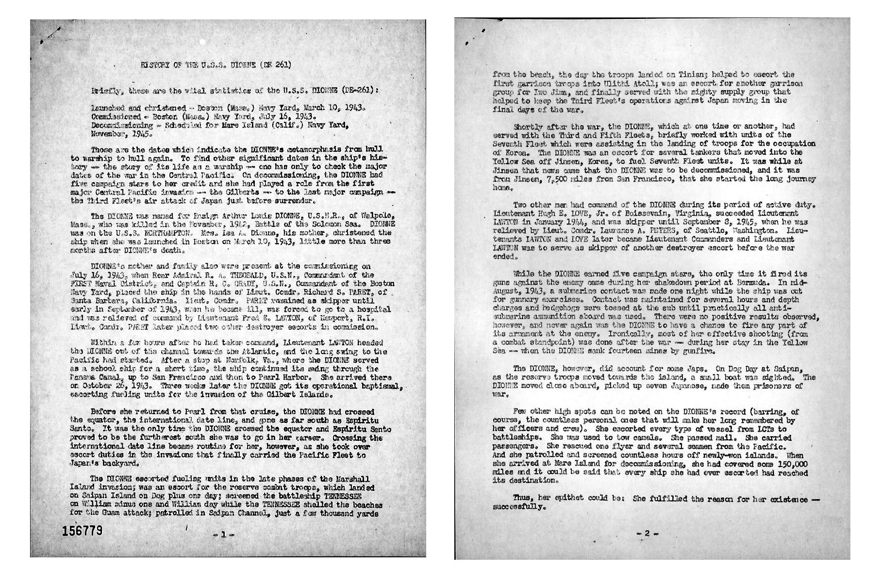 | View the USS Dionne (DE 261) DANFS history entry located on the Naval History and Heritage Command web site. |