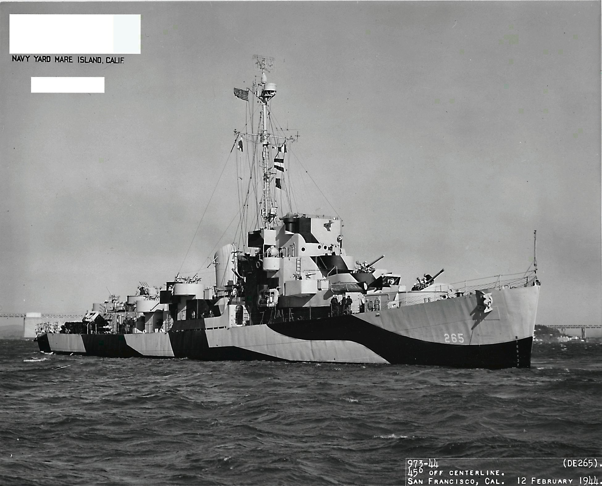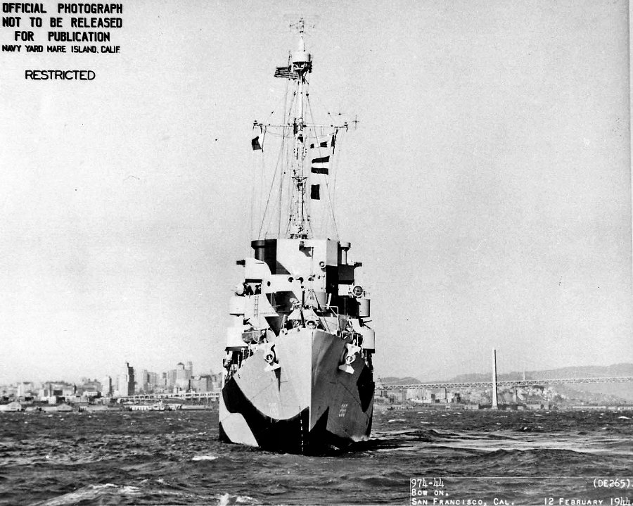 140k | 12 February 1944: bow on view, off San Francisco. (U.S. Navy Photo #DE-265-974-44) |