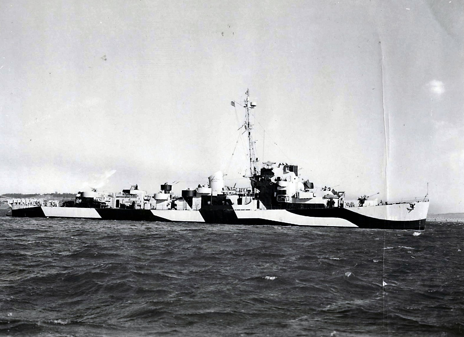 425k | 12 February 1944: San Francisco Bay - Starboard bow view of Cloues off Mare Island. (U.S. Navy photo #CP-DE-265 19-N-65251 from the National Archives and Records Administration, courtesy of Chris Wright) (This is a better copy of a photo sent in earlier by Kenneth E. Catlin, PO1, USS Cloues, 1943 - 1945) |