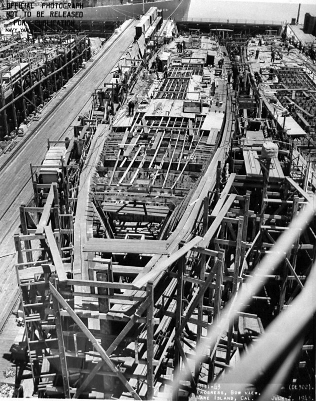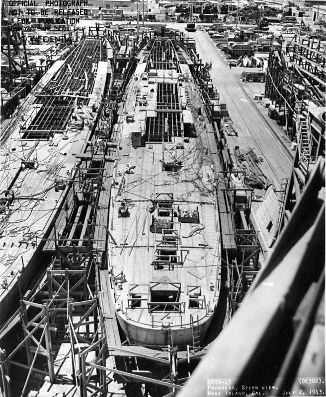 175k | 02 July 1943: Bow view of USS Lyman (DE 302) is seen on the building ways at Mare Island. The USS Lake (DE 301) is on the right. (U.S. Navy photo #DE-302-4811-43) |